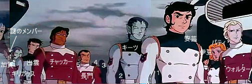 3.は4と比較すると大柄で体格の良い人物と分かるが、陸奥を除く4人で体格の良いのはカッツと甲斐の二人である。しかし、3の人物を見ると頭髪がラウンドしており、この特徴に当て嵌まる人物はカッツただ一人である。そういうわけで、3.はサルタ・カッツ、また、4.の人物は角刈りであり、この特徴を持つのは残りでは甲斐である。というわけで4.は甲斐シノブ、そして謎のメンバーは見たところ地球人のようなので5.はショータ・クロイツと容易に判別できる。