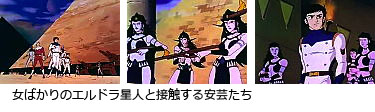先行偵察中のラガーチームは前方の惑星からミサイル攻撃を受ける。「まだ我々を苦しめ足りないのですか、、」、攻撃の合間にシルエットで流れ込む悲痛な声から、安芸は自分たちがガルベストンと間違われて攻撃されていることを知る。惑星に降り立ったラガーチームはそこで大量のピラミッド状の建造物とズノウと名乗るエルドラの女王に接触する。 | ||||