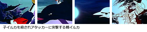 ビヨヨヨヨーン(エネルギー球の音) 安芸 「うわっ!」(エネルギー球をよける) イルカ 「ゴボッ!ゴボゴボゴボ!」 (避けたエネルギー球が子イルカを直撃、狼狽する親イルカ) 安芸 「この野郎!」(立ち上がりアタッカーに突撃) イルカ 「ゴボゴボゴボゴボ!」 (戦いに巻き込まれ、子イルカを殺された親イルカがアタッカーに特攻) 安芸 「あっ! やめろっ!」(突撃するイルカを呼び止める) ビヨヨヨヨーン(エネルギー球の音)