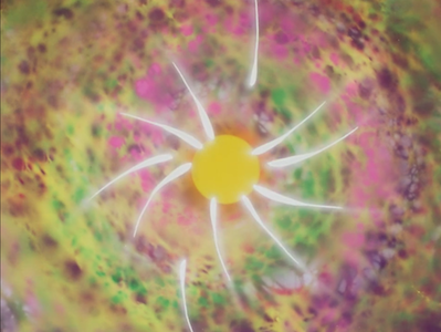 それはワープするときに描かれるような光のあとに現れる、どこと知れない宇宙と、そこに浮かぶ陸地のイメージである。山に囲まれたその野原で、全裸の二人が駆けている。そのあと、卵子に精子が出会って受精する場面が唐突に現れる。