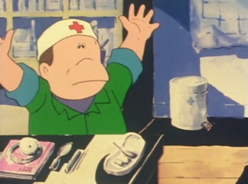 「天人是を許さず」という大時代なナレーションといい、この所は脚本家チームが浪花節合戦をしているような本作だが、松本零士の作品は途中で終わったり話が途切れたりすることが多いので、この際だから隙間で色々試しておこうという合意がスタッフ間にあったのかもしれない。脚本の山崎晴哉は天才バカボンなどマンガチックな話を得意とする脚本家で、「スペースウルフ(戦闘機)ぐらい操縦できる」と、ドクターが意気揚々と戦闘機に乗り込む場面はまんまバカボンのパパである。