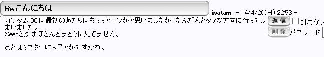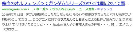 小林: 抵抗できない相手を中傷するなんざオルフェンズの三日月みたいだな、ああいう奴はヒーローとは言わないんだよ、レビューでも書いたが卑怯者と言うんだ。しかし良く分からん、私はオルフェの悪口を始終書いていたから叩かれるのは分かるが、iwatamやラスカルが何をしたんだ?