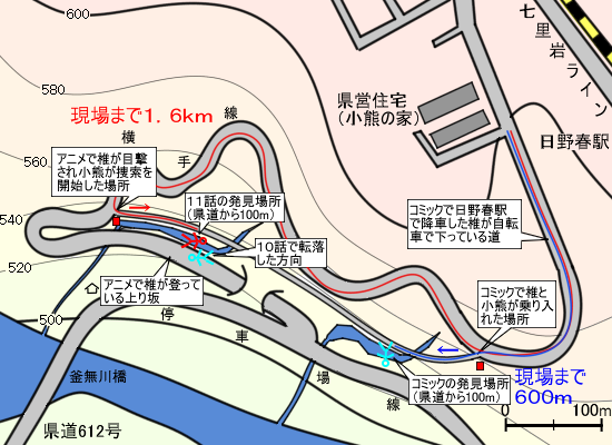 地図を彩色して図示すると、アニメとコミックでは方向が正反対であることが分かる。アニメは10話と11話アパンでは椎は下りで転落し、頭を釜無川側に向けているが、発見された時には日野春駅の方向に頭を向けており、川に落ちた自転車の方向も同じで、電話から発見までの間に人も自転車も方向が変わっている。